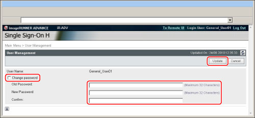 Ein allgemeiner Anwender für die Local Device Authentication kann sein eigenes Passwort ändern. Das erhöht die Sicherheit privater Informationen. Der Systemadministrator (Administrator) sollte allgemeinen Anwendern mitteilen, dass sie ihr eigenes Passwort ändern können.