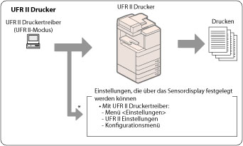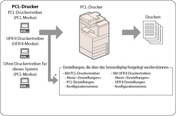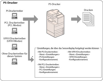 Unterschiede in der Bedienung bei UFR II, PCL, PS und Direct Print Druckern
