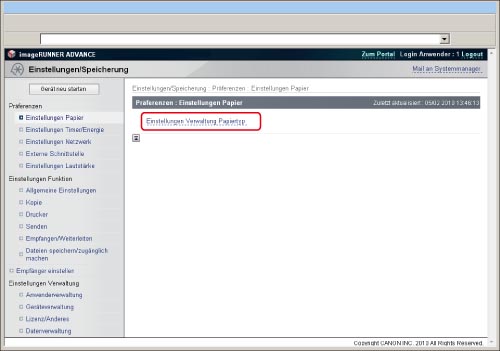 Klicken Sie auf [Einstellungen/Speicherung] → Wählen Sie [Einstellungen Papier] für <Präferenzen> → Klicken Sie auf [Einstellungen Verwaltung Papiertyp].