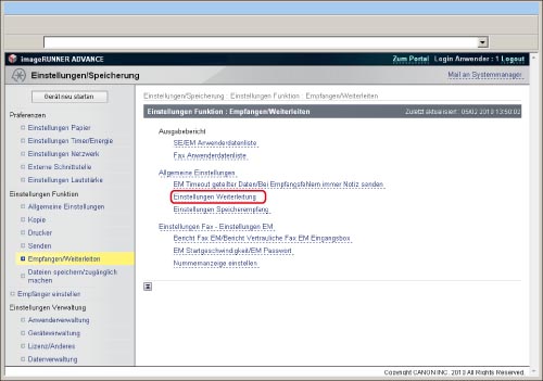 Zum Festlegen von Einstellungen zum Weiterleiten müssen Sie sich als Administrator einloggen.