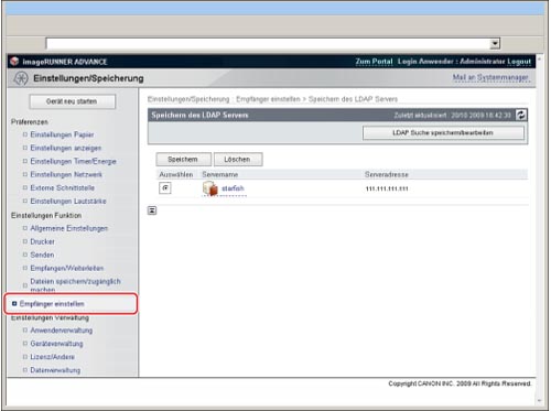 → [Empfänger einstellen] → [LDAP-Server speichern] berühren. Nähere Informationen zur Verwendung des Bedienfelds zum Festlegen der LDAP-Einstellungen finden Sie im Abschnitt "LDAP Servereinstellungen".Zum Festlegen von Einstellungen für den LDAP-Server müssen Sie sich als Administrator einloggen.