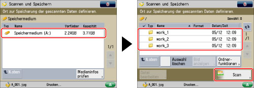 Wählen Sie das Speichermedium → Wählen Sie den Zielordner → Berühren Sie die Taste [Scan].