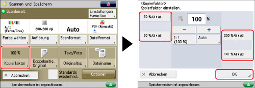 Berühren Sie die Taste [Kopierfaktor] → Wählen Sie den gewünschten Zoomfaktor → Bestätigen Sie durch Berühren der Taste [OK].