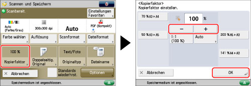 Berühren Sie die Taste [Kopierfaktor] → Wählen Sie den gewünschten Zoomfaktor über die Tasten [-] und [+] → Bestätigen Sie durch Berühren der Taste [OK].