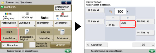 Berühren Sie nacheinander die Tasten [Kopierfaktor] → [Auto].