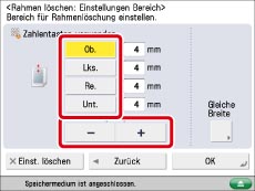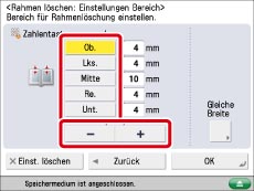 Berühren Sie die Tasten [Mitte] und [Seiten] → Stellen Sie die gewünschte Breite für die Rahmenlöschung über die Tasten [-] oder [+] ein.