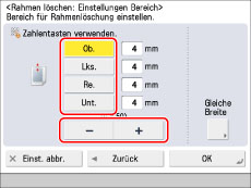 Berühren Sie die Tasten [Mitte] und [Seiten] → Berühren Sie die Taste [-] oder [+], um die Rahmenlöschungsbreiten einzustellen.