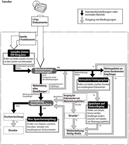 *1 Wenn die Option <Empf.Datei speich./druck.> unter [Einstellungen Weiterleitung] aktiviert ist, werden weitergeleitete Dokumente entweder ausgedruckt oder in der Box Speicherempfang gespeichert.