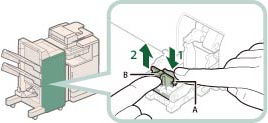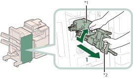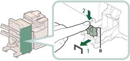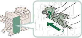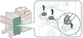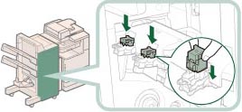 Führen Sie eine manuelle Neupositionierung der Heftklammern in der Sattelhefteinheit durch, nachdem Sie den Heftklammernstau beseitigt haben. (Vgl. Abschnitt "Neupositionieren der Sattelheftklammern".)