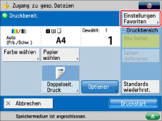 Definieren Sie die Druckeinstellungen → Berühren Sie die Taste [Einstellungen Favoriten].