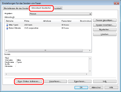 Sie können das Speicherziel des Adressbuchs des Faxtreibers (Canon Faxtreiber-Adressbuch) ändern oder ein neues Adressbuch erstellen.