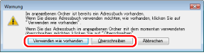 Ist in dem im Schritt 3 ausgewählten Ordner bereits ein Adressbuch vorhanden, wird das folgende Meldungsfeld angezeigt. Klicken Sie zum Verwenden des vorhandenen Adressbuchs auf [Verwenden wie vorhanden]. Möchten Sie das Adressbuch des Faxtreibers verwenden, klicken Sie auf [Überschreiben].