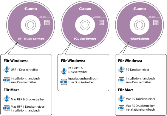 Der Druckertreiber wird von einer User Software CD-ROM installiert. Wenn es zwei oder mehrere CD-ROMs gibt, wählen Sie die richtige CD-ROM und den richtigen Druckertreiber anhand der folgenden Informationen aus.