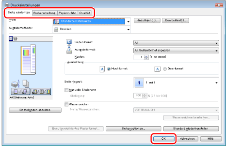 Nähere Informationen zu den verfügbaren Druckfunktionen finden Sie unter "Druckfunktionen" oder in der Online-Hilfe. (vgl.Anzeigen der Online-Hilfe").