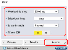 Si sus transmisiones de documentos tardan mucho en iniciarse, es que las líneas telefónicas de su zona se encuentran en mal estado. Seleccione una velocidad menor. Puede seleccionar [33600 bps], [14400 bps], [9600 bps] o [4800 bps].