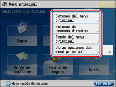 en la parte superior derecha de la pantalla, se muestra la siguiente pantalla. Seleccione las opciones en la pantalla mostrada y establezca la visualización de la pantalla Menú principal.