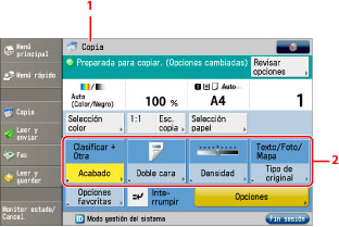 de la parte superior derecha de la pantalla de funciones básicas de [Leer y enviar], la pantalla de funciones básicas de [Fax] y la pantalla Enviar del [Buzón de fax/I-fax].Para volver a la pantalla Menú principal, pulse [Menú principal].