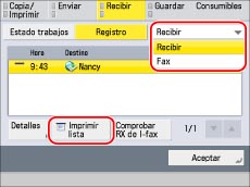 Para imprimir el historial de recepciones para el informe de actividad de fax, seleccione [Fax] en la lista desplegable. (Consulte "INFORME DE ACTIVIDAD TX/RX FAX".)