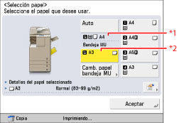 Si está activada la opción [Guardar opciones prefijadas bandeja MU] en Opciones de uso del dispositivo, sólo es posible hacer impresiones reservadas con el tamaño y tipo de papel guardados. (Consulte "Guardar opciones prefijadas de bandeja multiuso".)