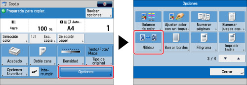 Puede ajustar la nitidez para copiar texto y líneas con un fuerte contraste. También puede reducir la nitidez de los puntos de los medios tonos de las fotos impresas, etc. para que la copia presente una imagen más suave.