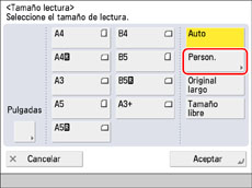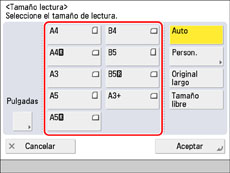 Puede especificar manualmente un tamaño de lectura al leer originales que no pueden detectarse con [Auto]. También puede guardar el tamaño de lectura especificado.