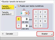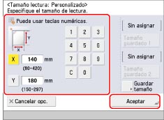 Pulse [X] y [Y] → introduzca un tamaño de lectura con las teclas numéricas → pulse [Aceptar].