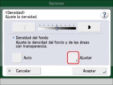 Si ajusta la densidad de fondo pulsando [Ajustar] para <Densidad del fondo>, se cancela la opción [Auto]. De forma similar, si pulsa [Auto] mientras realice ajustes manualmente en [Ajustar], sus ajustes se cancelarán. El equipo ajusta automáticamente la densidad para que coincida con el fondo.