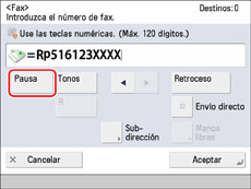 Pulse [Pausa] después de introducir el número de acceso a línea exterior ('R' en el ejemplo anterior) y antes de introducir el número de fax.