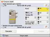 Si durante la impresión aparece un mensaje que indica que cargue papel, el resto de impresiones se harán automáticamente después de cargar el papel correcto. Si selecciona otro casete, el resto de impresiones se harán después de pulsar [Aceptar].