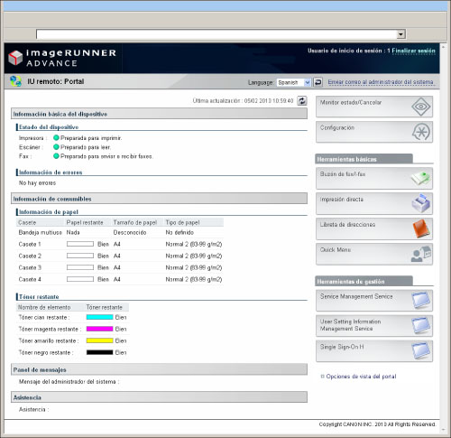 La IU remota permite acceder al equipo a través de una red para visualizar su estado actual y su configuración, así como el estado de todo el procesamiento de la información y de los trabajos. El equipo se puede gestionar desde un ordenador conectado a la red sin tener que realizar operaciones en el propio equipo. Si especifica la dirección IP del equipo en el navegador web, la página de inicio o la pantalla principal de la IU remota aparece en la pantalla del ordenador, como se muestra a continuación: