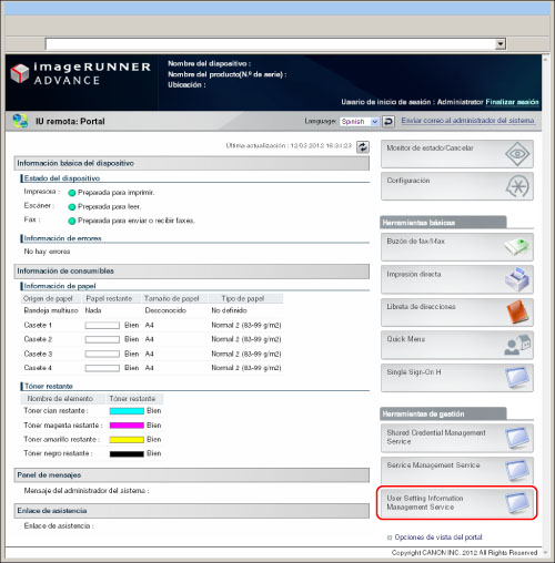 Para especificar cada opción del servicio de gestión de información de opciones de usuario, es necesario acceder e iniciar sesión en el equipo desde el navegador web. Esta sección describe el procedimiento de acceso al equipo desde la página de portal de la IU remota.