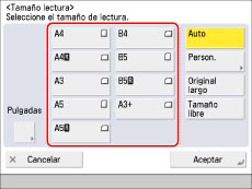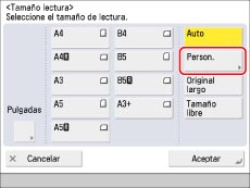 Puede especificar manualmente un tamaño de lectura al leer originales que no pueden detectarse con [Tamaño auto]. También puede guardar el tamaño de lectura especificado.