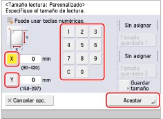 Pulse [X] y [Y] → utilice las teclas numéricas para introducir el tamaño de lectura en mm → pulse [Aceptar].