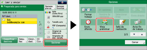 Especifique el destino → pulse [Opciones] → [Vista preliminar].