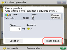 Si aparece la siguiente pantalla después de leer el último lote de originales, pulse [Iniciar almac.].
