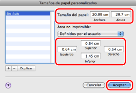 Para eliminar el tamaño del papel registrado, selecciónelo en la lista en el cuadro de diálogo [Tamaños de papel personalizados]/[Tamaños de página personalizados] y haga clic en [-].