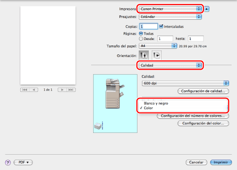 Seleccione la impresora → [Calidad] → [Blanco y negro] o [Color] en [Modo de color].