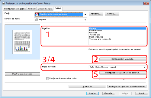 Para conocer las instrucciones acerca de cómo mostrar la pantalla del controlador de impresora, consulte "Impresión" o "Configurar las opciones de impresión prefijadas".