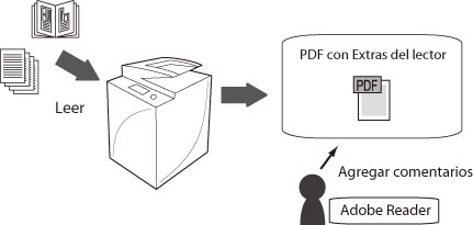 Si selecciona el modo Extras del lector cuando convierta un documento de papel a archivo PDF, podrá agregar/editar comentarios, y agregar firmas utilizando Adobe Reader (Adobe Reader 7 o posterior).