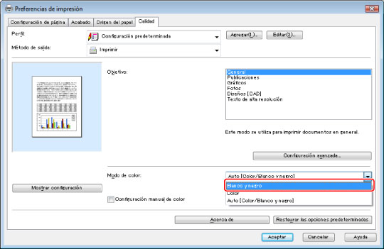 En la hoja [Calidad], seleccione [Blanco y negro] en la lista desplegable [Modo de color].