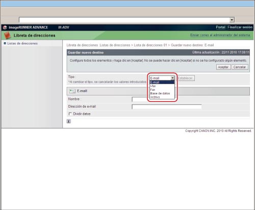 Seleccione [E-mail] de la lista desplegable [Tipo] → haga clic en [Establecer]. Introduzca un nombre y dirección de e-mail en la pantalla [Guardar nueva dirección: E-mail].