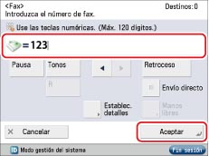 En la pantalla Menú principal, pulse [Fax] → [Opciones] → [Aviso fin de trabajo] → seleccione el destino al que desea enviar un aviso de fin de trabajo → pulse [Aceptar] → [Cerrar].