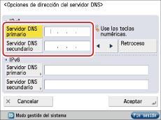 Si no están especificadas, póngase en contacto con el administrador del sistema y especifique las direcciones IP del servidor DNS primario y del servidor DNS secundario.