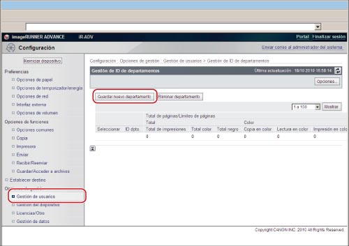 → [Opciones de gestión] → [Gestión de usuarios] → [Gestión de ID de departamentos] → [Totales de páginas].