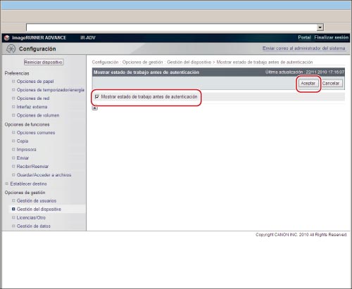 Para especificar el estado del trabajo antes de las opciones de visualización de autenticación, haga clic en [Mostrar estado de trabajo antes de autenticación] → deseleccione [Mostrar estado de trabajo antes de autenticación] → haga clic en [Aceptar].