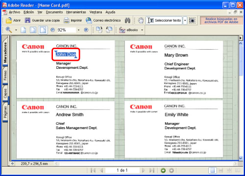 La lectura con la función OCR (texto para búsquedas) permite convertir tarjetas de presentación en archivos PDF o XPS con búsqueda. El modo PDF con búsqueda es útil en muchas situaciones. En esta sección se explica la creación de etiquetas de direcciones empleando la función de [Combinar correspondencia] de Microsoft Word 2003.