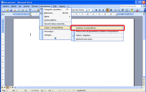 Abra un nuevo documento de Microsoft Word → haga clic en [Herramientas] → [Cartas y correspondencia] → [Combinar correspondencia].