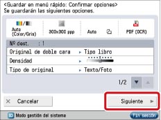 Si selecciona [On], al recuperar el botón guardado, aparece una pantalla de confirmación de las opciones. Para más información acerca de la pantalla de confirmación, consulte, " Enviar un documento utilizando el botón del menú rápido". Si selecciona [Off], al recuperar el botón guardado no aparece la pantalla de confirmación de las opciones.