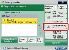 Puede convertir imágenes de originales en color/escala de gris leídas con un resolución de 300 ppp para compactarlas en archivos PDF o XPS (aprox. 1/10 del tamaño original). Este modo elimina la emisión de tamaño de archivo grande de documentos digitalizados, reduciendo los documentos de color al tamaño de documentos en blanco y negro. Esto también le permite reducir la carga de la red y de los servidores. Para obtener más información, consulte