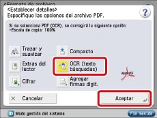 Pulse [OCR (texto búsquedas)] → [Aceptar] → [Aceptar].